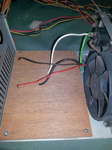 El paso final es colocar la madera dentro de la fuente de alimentación. Esta es probablemente la parte más fácil. Sin embargo, hay un pequeño truco. los agujeros se perforan diferente basado en de qué lado están más cercanas. Los agujeros cerca del ventilador y fuente de alimentación son un poco más cercanos del borde de los huecos opuestos a ellos. Poner la madera en la parte inferior de la fuente de alimentación y utilice los tornillos 4-40 para sujetar la madera a la fuente de alimentación.