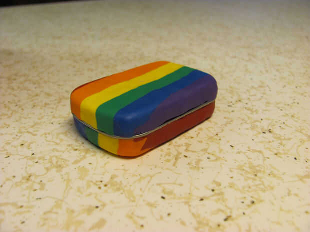 Hacer una caja de arcilla de arco iris de una lata altoids mini.