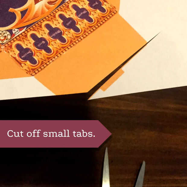 A continuación, corte la plantilla. Siga las líneas tan de cerca como sea posible, asegurándose de no dejar ningún blanco alrededor de los bordes. Hay pequeñas lengüetas que usted puede cortar con seguridad. Vea las imágenes de arriba.