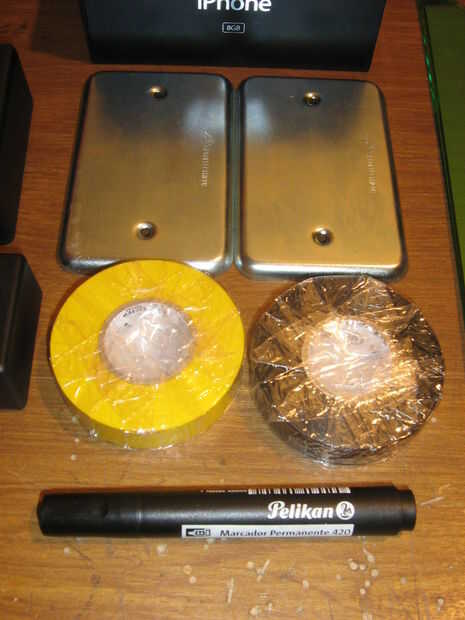 2 placas de metal rectangulares (para instalaciones eléctricas). Le cand encontrar en ferreterías. Para los lados de la trampa.