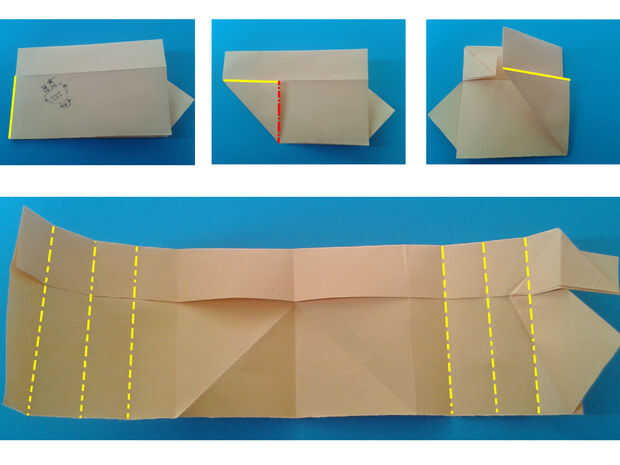 Doblar a la izquierda abajo de esquina para el pliegue horizontal (línea amarilla).