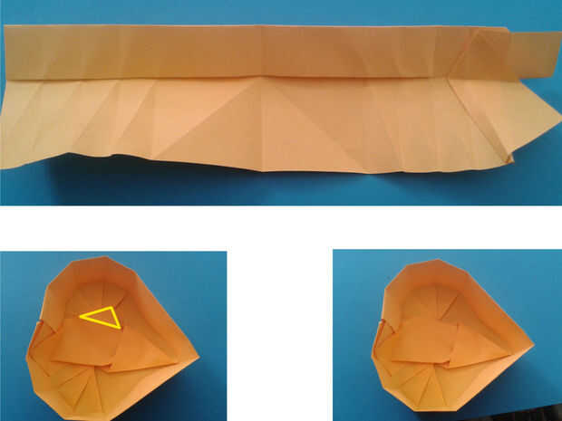 Doblar el borde superior utilizando la ficha como guía (línea amarilla) en el paso 10.