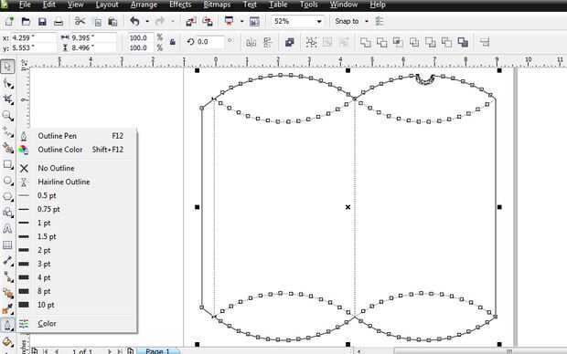 Seleccione todas las líneas y luego todos los grosores de línea "rayita". El interior líneas son líneas perforadas que da exactamente lo que necesita para doblar.