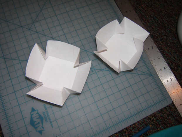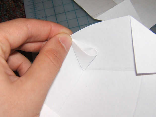 Iniciar el cuadro de una de las esquinas dobladas y doblarla hacia adelante en hasta cubrir los bordes de la caja y forma un pequeño bucle. Una vez que los bordes estén alineados correctamente, aplanar el bucle por lo que arruga (para una explicación más clara, véase los comentarios en las imágenes de abajo).