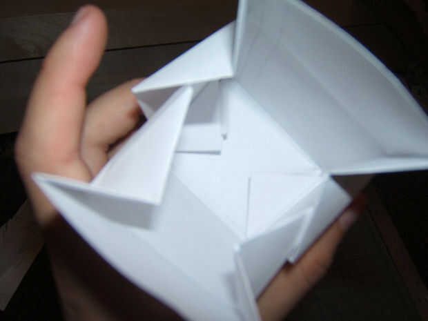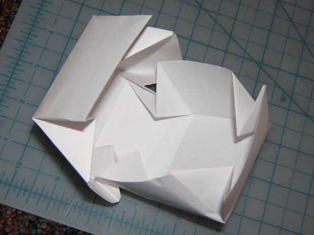 Tomar ambas mitades y exprimir en una caja de formación. Asegurándose de que el triángulo de los pliegues línea plano, diapositiva de una mitad de la caja en el pliegue de la otra. Deben ajustarse tanto como sea posible (ver fotos).
