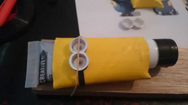 Como se puede ver en la foto extraña con la banda elástica alrededor de él, quería algo para mantener las gafas en su lugar mientras que el pegamento que también significan que tenía que ser cuidado de no colapsar el tubo bajo presión. Coloqué uno de mis tubos de pintura dentro del rollo para actuar como soporte.
