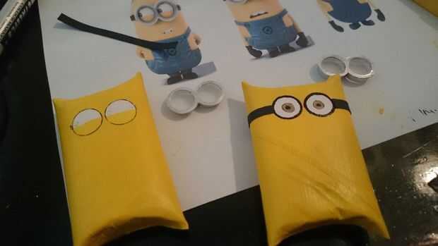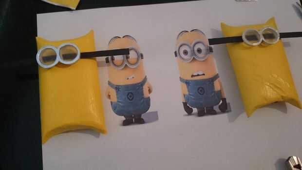 1. corta unas tiras de papel negro (yo usé un tipo suave, reciclado de papel que parecía un poco de fieltro) en tiras finas para las bandas de anteojos. antes de que les pegue, envuélvalas alrededor con las gafas en el lugar que quieras, mida y corte la longitud correcta.