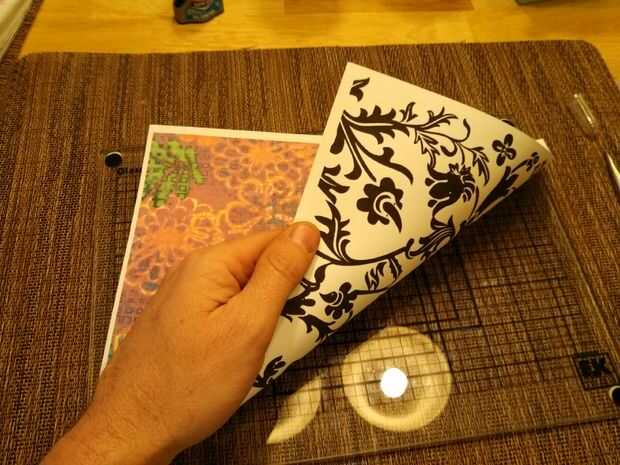 El patrón de freeprintable.com es donde empecé. Pero quería cambiar la decoración exterior. Se pueden encontrar cientos de sitios web para conseguir algo que te gusta. Elegí un colorido exterior y luego un blanco y negro floral para el interior. Establecer el interior por la impresión en el reverso de la hoja.