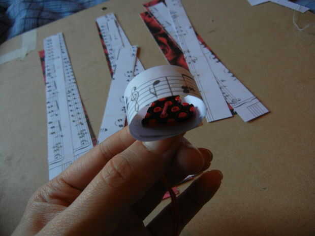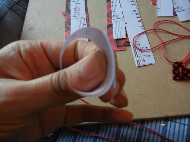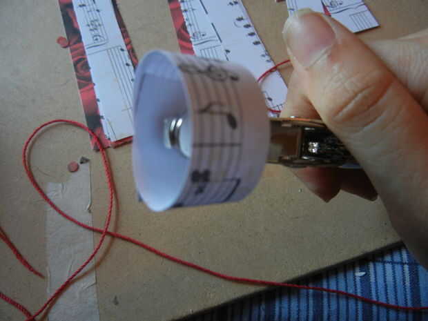Tomar la tira de 5 pulgadas de cartulina y y se enrollan en los extremos entre sí y vuelta por aproximadamente una pulgada. Entonces usando la perforadora, perforar dos agujeros en la cartulina whee los solapes de stock de tarjetas. Agarra el botón roscado y enhebre el hilo por los agujeros como se muestra en el uso de pictures.then una pinza para sostener la burla del hilo de rosca.