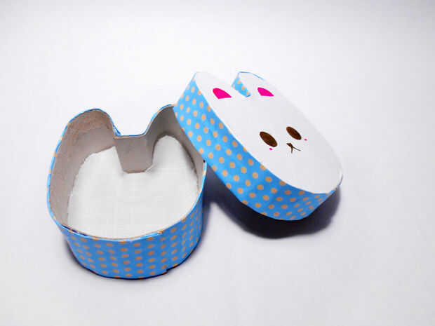 Para esta decoración de la caja de conejito, uso papel blanco por su cara y dibujaron los ojos, boca y oídos con los marcadores.