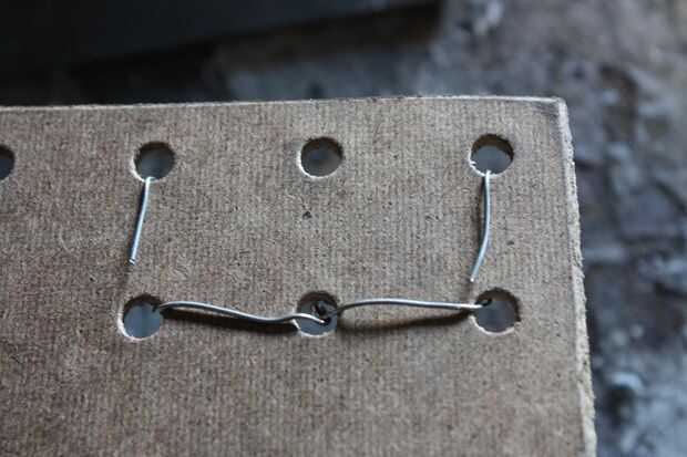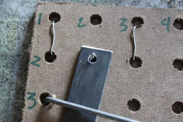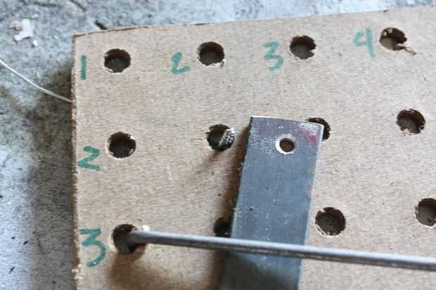 Alimentar la parte retorcida de la parte inferior por el agujero (2-2). Tirar las "colas" recta a través de algunos agujeros adyacentes y venir alrededor y a través de los otros dos hacia la parte inferior.