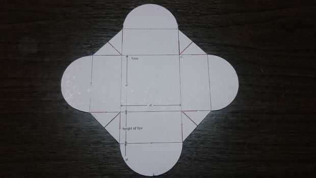 Las líneas rojas de cortar y doblar todas las líneas de negro. Tome una buena mirada en el patrón, algunas líneas rojas deberán cortarse a mitad de camino sólo para formar las esquinas de la caja. Es posible que es difícil cortar la línea roja de medio que es de adentro hacia afuera. Bueno, echa un vistazo en el número de cuadro #2. Se debe doblar una parte antes de hacer el corte.