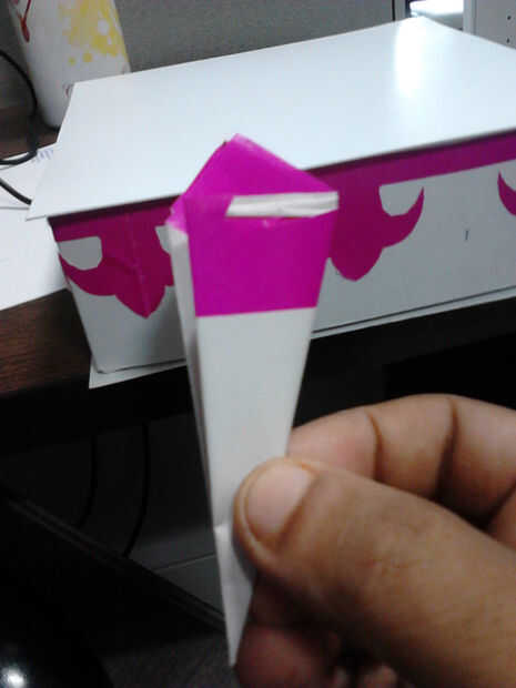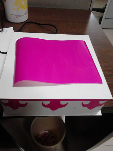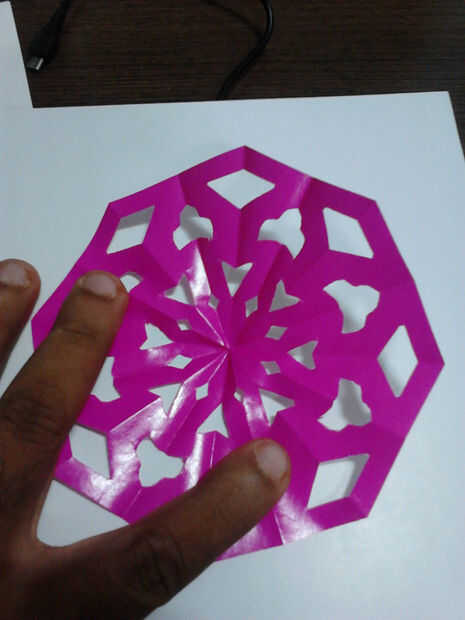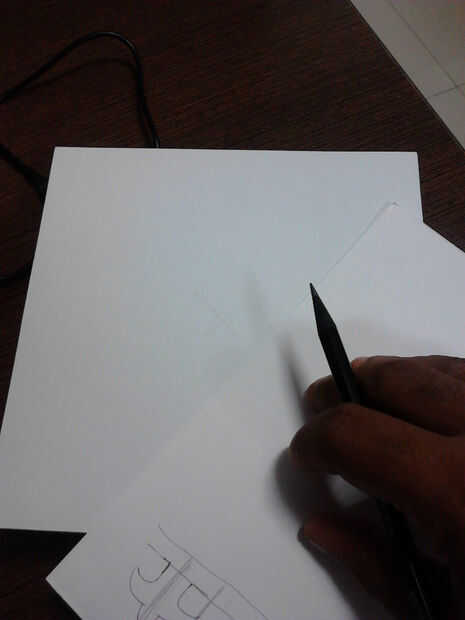 Para la tapa de la caja corta el papel al tamaño y dobla 4 veces para hacer cuña. Ahora empiece a cortar el papel con pequeñas formas. No corte el papel al otro lado. Cuando haya terminado corte, abrir el documento. Obtendrá un hermoso patrón. Algún ensayo y error le dará una idea de cómo cortar. Marque la parte superior de la caja para el centro. Utilice una regla y dibujar líneas que se cruzan durante el uso de los puntos diagonales.