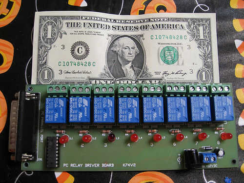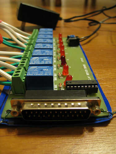 Utiliza tensiones de puerto paralelo de la computadora para activar un banco de 8 relés. Cuando se dispara, los relés de envían voltaje a lo que está conectado a sus bornes.