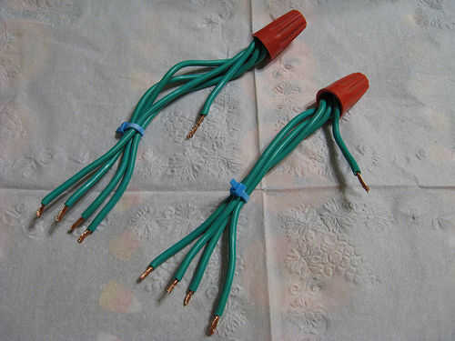 Finalmente, las dos 4" patas de dos arañas se conectará con otra tuerca para cables, pero no todavía. Esto puede llevar a preguntar, ¿por qué no construir una araña de alambre grande con 8 alambres? La respuesta es bastante simple. Es difícil y peligroso poner demasiados cables dentro de una tuerca de alambre simple. Capuchones están clasificados para cuántos alambres de un calibre de algunos pueden llevar a cabo junto con la tuerca. (Yo puedo han roto algunas de esas Clasificaciones al construir este proyecto.)