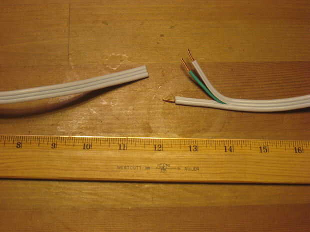 Si la extensión no tiene tres cables a tener un cable verde en el centro un alambre liso a un lado que lleva la tensión (el cable negro) y un cable con crestas en el otro lado (el cable blanco). Comprobar estos antes de hacen cualquier conexión eléctrica vivo. Incluso esta había desordenado y me lo cogió a tiempo.