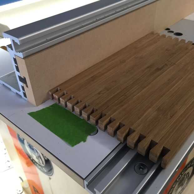 - Hacer cortes de prueba en el material extra. Ajustar la plantilla según sea necesario. Para las juntas que estén demasiado flojas, mueva la plantilla hacia usted ligeramente. Para las juntas que estén demasiado apretadas, mueva ligeramente la plantilla de lejos de usted. Para evitar rasgaduras, coloque siempre una Junta espaciador con apoyo detrás de los cortes. Cada borde del tablero de espacio puede ser utilizado dos veces. Me corte un borde limpio con la Sierra de mesa y continuar utilizando estos tableros hasta que son demasiado cortos.