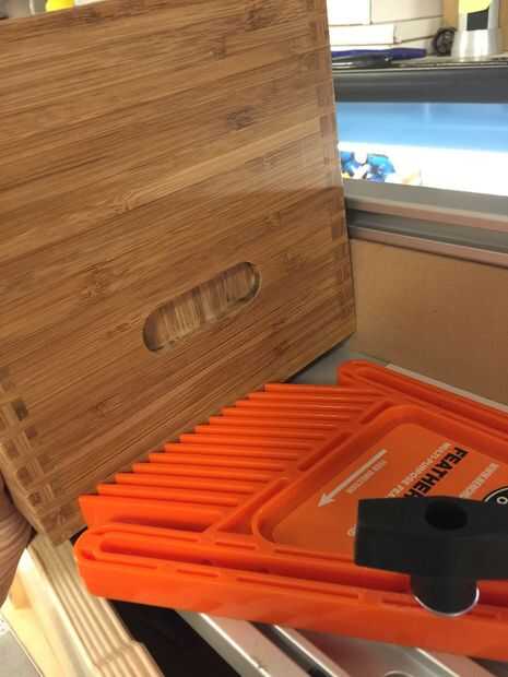 - Las ranuras del dedo fueron cortadas con un 3/4" poco recta. Se cortaron a 1/4" profundidad en los laterales y 1/8" profundidad de la tapa. Después de instalar el 3/4" recto poco en la mesa de fresadora, siempre hacer una prueba de corte Compruebe la profundidad de corte.