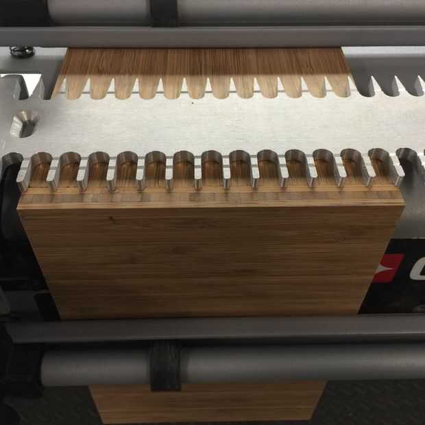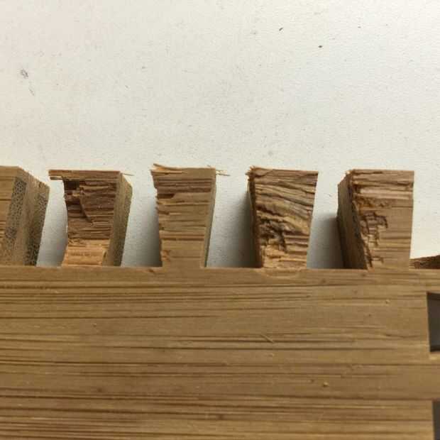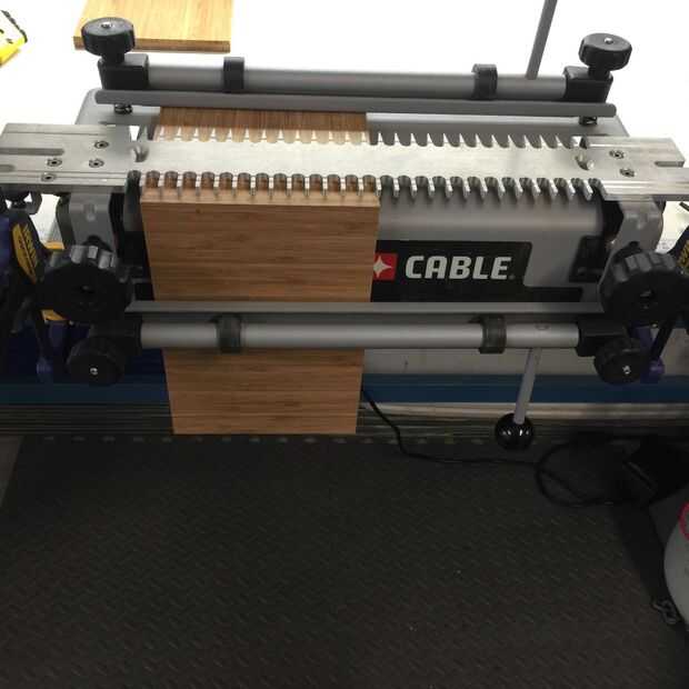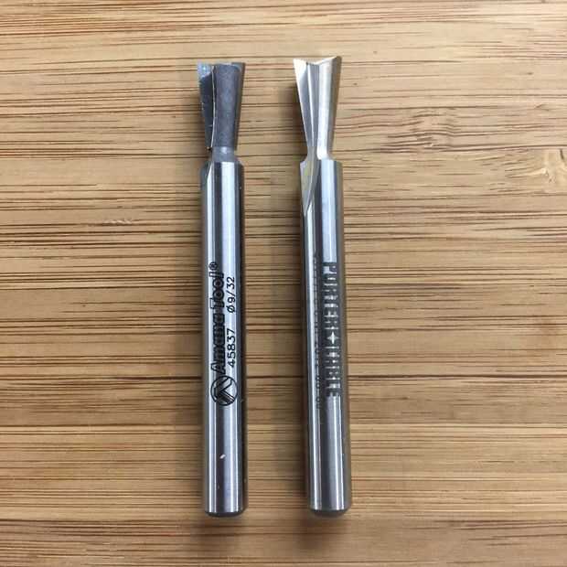 - PRECAUCIÓN: No utilice brocas proporcionadas por Porter-Cable. Mis cortes iniciales tenían una cantidad inaceptable de rasgue-hacia fuera. Si usas plyboo, usted necesitará comprar brocas de carburo adicional. Esto también se aplica a los empalmes de cola de pato más grandes también. He encontrado que realizaron Whiteside o Amana brocas de carburo bien detallados en la sección anterior funcionada mucho mejor.