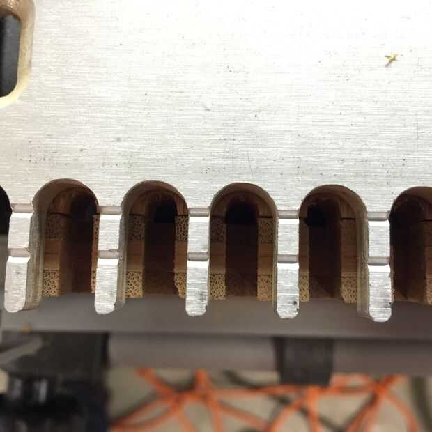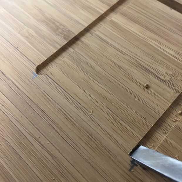 - Puesto que muchas de las ranuras no recorrer todo el camino, usted necesitará hacer paradas apropiadas para cada pieza. Mayoría de las veces, coloqué tiras de cinta hacia abajo para indicar los lugares de parada. A veces, esto significa que necesitan cuidadosamente Deslice la madera en el poco movimiento y corte a la parada.