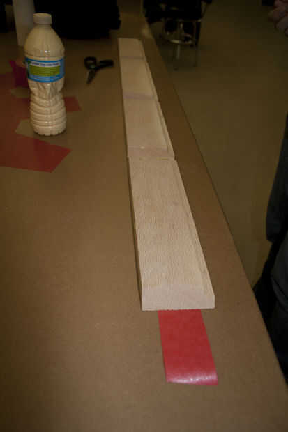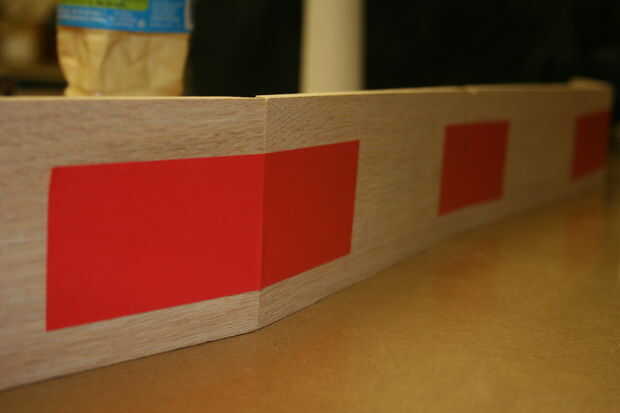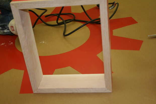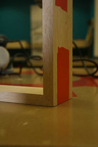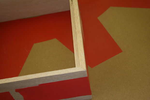 Colocar las tablas en el orden que desee, por lo que al doblarlas, tiene su caja. Añadir cinta al exterior de la caja dejando un pequeño gancho agarrador por lo que se puede plegar la cinta. Pegar los ingletes manteniendo la cola más cerca al exterior de la caja. Es más fácil lijar el exterior y el interior, si el pegamento se derrama.