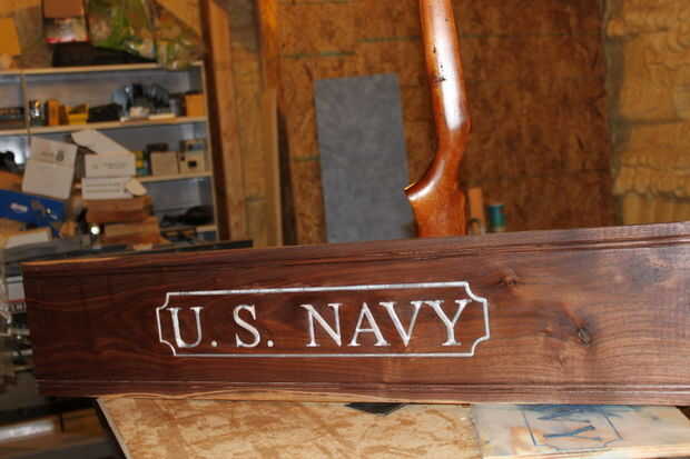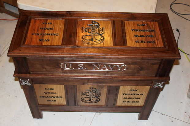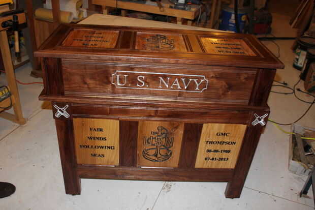 Después de que el diseño fue finalizado, mi amigo quería utilizar materiales que tenían significado para él, vivió en una casa que fue construida en la década de 1920 temprano y había recientemente remodelado una porción de la casa y tenía algunos Nogales y álamos que fue rescatado de la remodelación. (la madera oscura es nogal y la madera más ligera es cottonwood molido localmente en la década de 1920). El grabado fue encaminar en un ranurador del cnc de escritorio y las letras fue pintada plata en nogal y negro en el álamo. El trabajo del marco es enclavijado para la fuerza. Los paneles flotan en una ranura (slot) en los marcos. Las tapas se abisagran en las bisagras de madera con un eje de varilla de acero.