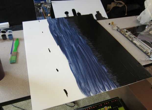A continuación, tomé otra hoja de plástico, el mismo ancho que la primera pieza y se procedió a pintar el cielo y el agua con pintura acrílica. Para el cielo, he utilizado una técnica de pintura degradado con negro en la parte superior, púrpura en medio del cielo y la pintura azul en la parte inferior (los guiones en la parte inferior del cielo inacabado es marcar donde quería el agua para ser. He utilizado negro ya que el reflejo de la ciudad haría la parte superior del agua negra, para no tener que preocuparse por una pintura en un color oscuro con uno más ligero.)
