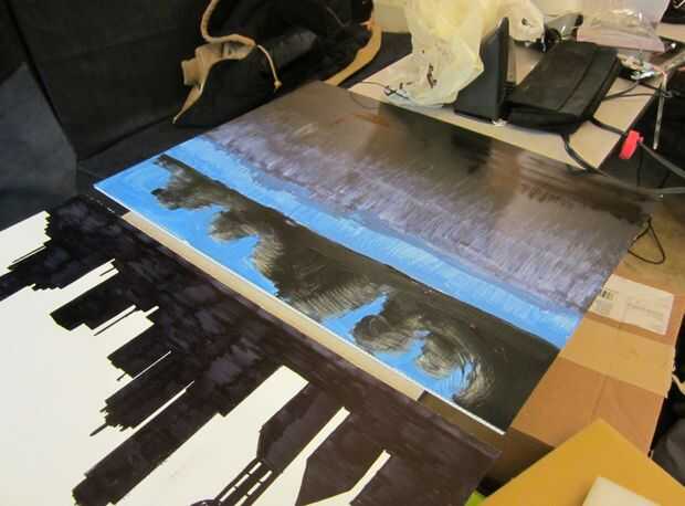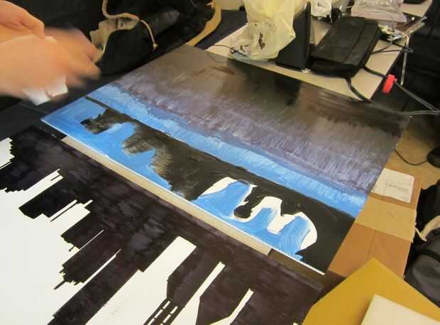 Para el agua, que quería hacer una reflexión de la ciudad, así que poner la ciudad que previamente cortamos (no ha sido cortado estas fotos todavía, pero eso no importa), contra el agua y más o menos pintado reflejo negro, centrándose en que los edificios más altos significaban que tendría que pintar el negro fomente hacia fuera la ciudad en el agua. Para fusionar el reflejo con el agua, hice la misma técnica de pintura como lo hice con el cielo, dejando un poco espacio alrededor de las partes quería mezcla y mezcla con un pincel de esponja.