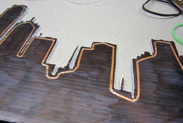 Mientras esperaba para que la pintura se seque sobre el fondo, tuve ayuda instalar el chibitronics del LED en los bordes externos superiores de la parte trasera de la ciudad, por lo que cuando se enciende, la luz viene desde detrás de la silueta de la ciudad. Hay dos tiras de cinta de cobre conectando el LED por lo que la corriente puede viajar a todos ellos. Una tira que conecta los puntos superiores de los 5 LED echada a un lado y la otra tira de conectar los puntos de dos fondo de ellos. Si los puntos están rotas en la cinta, un trozo de soldadura debe conectarlo. En uno de los extremos de la cinta, suelda en un enchufe de cargador de teléfono móvil con el extremo pelado en la cinta, así podemos alimentar energía el LED.