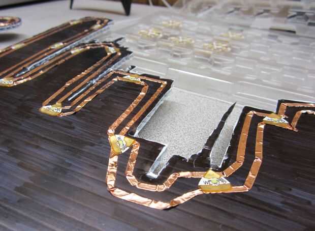 Dos: La cinta de cobre no se conecta al mismo punto de cada LED, para que la cinta es probablemente conectando el extremo positivo de cada LED y el extremo negativo de uno o dos de otro LED o dos. El LED que no coinciden para que haga del tirón.