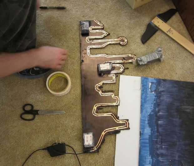 Cogí un trozo de espuma dura como soporte de mi, otra vez ya que fue puesta alrededor y corta unos trocitos. Los colores negro (en caso de que alguien los vio, no parece tan extraño como el blanco sobre el fondo negro) y puse cinta de doble cara para sujetar en su lugar. Yo entonces conjunto de que la ciudad pone para arriba para que coincida con el fondo del cielo.