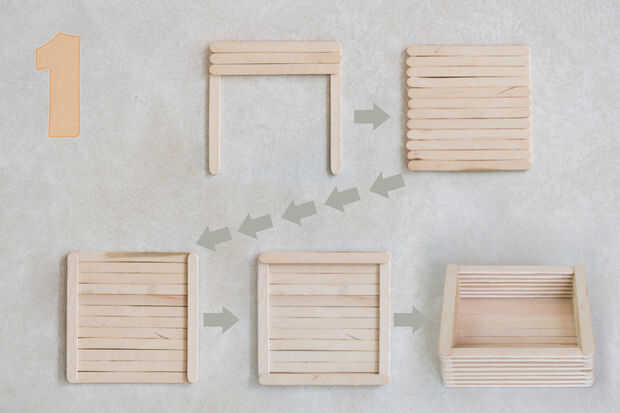 Hacer una caja de palitos como se muestra. Recomiendo usar pegamento blanco regular a los palos, porque es fácil que les Coloque de esa manera. Construir los lados de la caja hasta que la profundidad es menos de una pulgada.