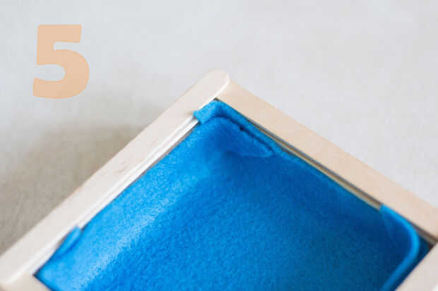 Colocar el fieltro en la caja y liso para que quepa. Si la pieza de fieltro es un poco grande y se extiende más allá de los bordes de la caja, siga adelante y cortar para que quepa en este momento.