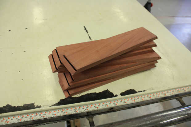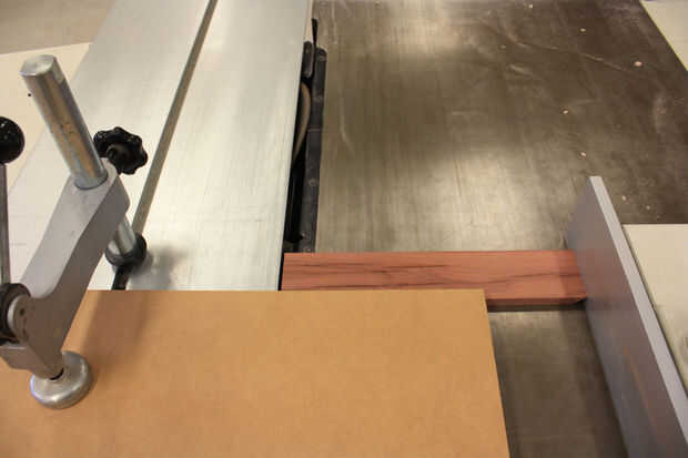 Esta es la parte difícil, las ranuras que coinciden perfectamente y deben ser también de una posición adecuada y la profundidad. Una buena regla es no extender la ranura a través más de la mitad del espesor de la pieza de trabajo. Nota: corté unos empalmes de práctica en algunos materiales de desecho antes de intentar con mi longitudes reales. Otra vez decidí usar el conjunto de la Sierra de mesa a un ángulo de 45⁰ a la profundidad necesaria. El único problema que tenía era que la hoja sobre la mesa la sierra sólo se inclina en una dirección, obligándome a cortar las ranuras en el otro lado de la valla de mitre. Mi solución fue instalar una valla de mitre sacrificio utilizando algunos MDF, sujetada a la guía de inglete. Esto junto con la guía me permitió cortar ranuras de juego perfectos en todas las caras inglete 16.