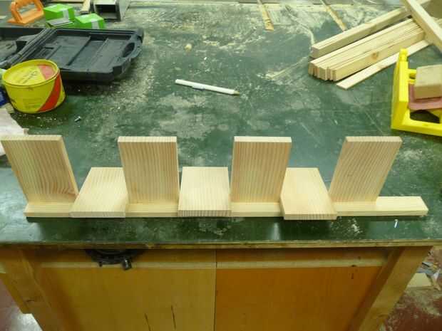 En la parte superior trasera de la guía central, pegamento y clavo cuatro de los espaciadores. Iniciar al ras de la izquierda y utilice a espaciadores adicionales para colocar correctamente los cuatro. Clave de la parte inferior con clavos acabado 5. Esto forma la fila 1.