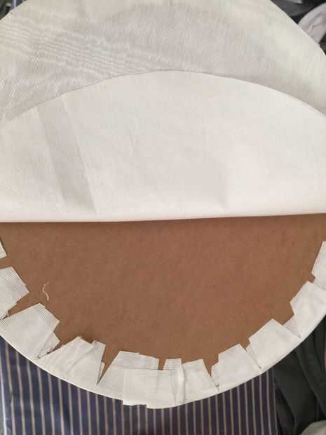 No planchar sobre el otro tamaño exacto tejido círculo en la parte inferior de la base de la caja del sombrero, se haces esto después de que el cuadro está montado.