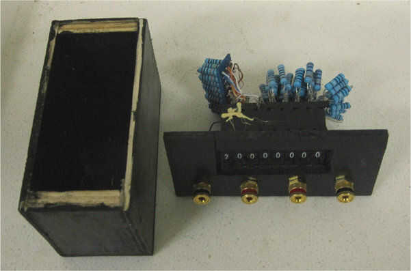 Había quitado los mensajes de audio de 3 vías de enlace de una casa anterior que tenía los cables en la pared. Así que en el panel frontal perforé 4 agujeros para 4 puestos de enlace y luego medir y cortar el rectángulo para los ocho década de carrera. Pinta la caja montada en parte y los otros paneles con una pintura de acrílico negra que no era conductor (había probado esto para un proyecto anterior).