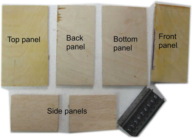 Corté las piezas de una caja de madera contrachapada gruesa de 1/4 pulgada scraps para la parte superior, inferior, frente y parte posterior de los paneles y madera contrachapada gruesa de 1/2 pulgada para los lados. Pegados y clavados en la espalda y la parte inferior a los lados.