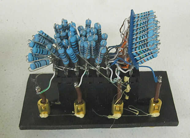 Atornilladas en los terminales de conexión de 3 vías en el agujero. No estaba seguro de que pude soldar los cables en el enlace entradas tan usado 24 calibrador de alambre (marrón en la foto) con un extremo doblado que estañado. Al final estañado se llevó a cabo por tornillos de los bornes. El otro extremo de los cables marrón provenientes de la terminal fue conectado como se muestra en el diagrama de circuito de los interruptores de la década por cable. Puedes ver la Junta de vero para los tres últimos conjuntos de resistencias (10 megas, 1 mega y resistencias de 100K).