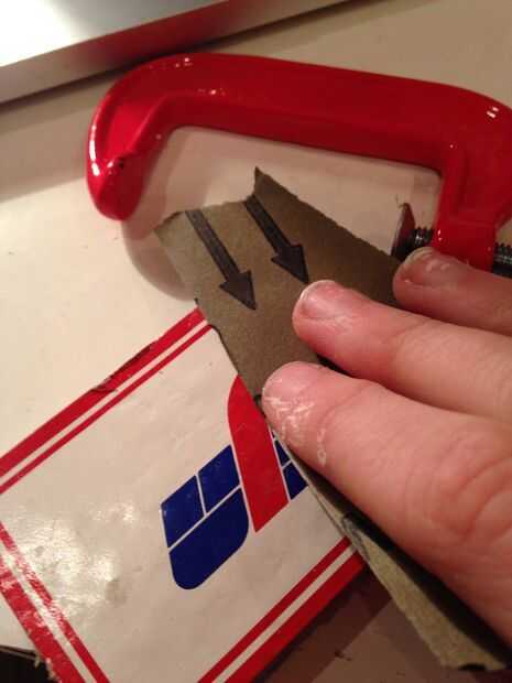 Quitar las tarjetas de las pinzas. Usando una lija de grano medio para eliminar cualquier escamas del secado pegamento a lo largo de la parte exterior.