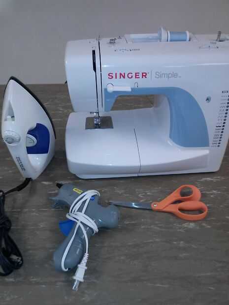 Máquina de coser, plancha, pistola de pegamento caliente. Caja de cartón. tijeras. retazos de tela.