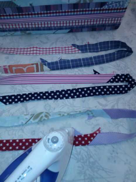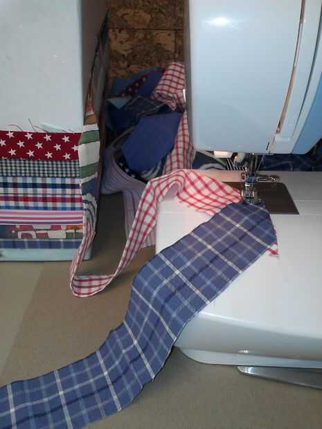 Cuando parece que va a correr fuera de la tela, dejar unos 8" y cosa más tela en el extremo. Presione a la tela por la mitad y continúe la bobina alrededor de la caja.