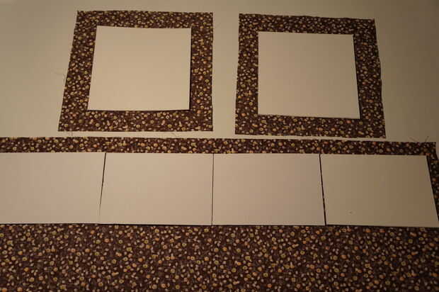 - Colocar los cuatro lados de la caja al lado de uno (como lo sería al lado del otro en la caja), con un espacio pequeño (2 mm) entre ellas para permitir que la tela doblar alrededor de los bordes. Trace una línea alrededor de cada pieza de cartón con un lápiz. En el pequeño espacio entre dos piezas debe ser sólo una línea de la marca. Cortar todo el conjunto de estas cuatro piezas con un extra 1,5 cm de margen de costura.
