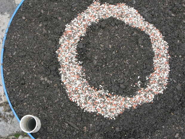 Hice un círculo de fertilizantes en el centro después de cavar un canal poco (Foto 2). Pongo 2 tazas de fertilizante de uso general 10/10/10 en el canal. El fertilizante se sienta bajo el plástico que impide que se disuelve demasiado rápidamente y Fertilice a sus plantas durante toda la temporada. Cuando el año próximo, quitar el plástico viejo, excavar y reemplazar el antiguo abono y estás listo para ir.