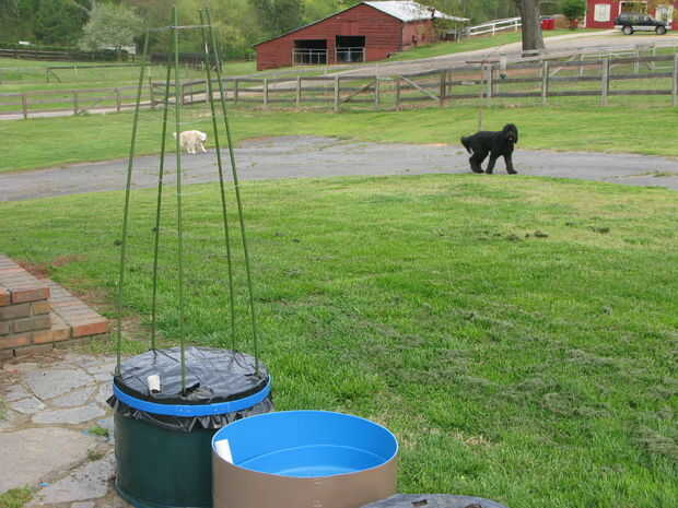 Quise sembrar algunos granos de poste y necesitaba algo para que suban. Así que antes de llenar la maceta con tierra, perforé cinco orificios de 1/2" en la pantalla de separación para permitir la colocación de postes de plástico. Después de rellenar con tierra e instalar el plástico, alambré simplemente las tapas de los polos para asegurarlos. Doblar hacia adentro los polos crea tensión contra el interior de la parte inferior de la olla por los polos y hace un enrejado muy estable. Mucho mejor que intentar añadir postes hacia el exterior de la olla más adelante. Sólo Waitin ' en los granos.