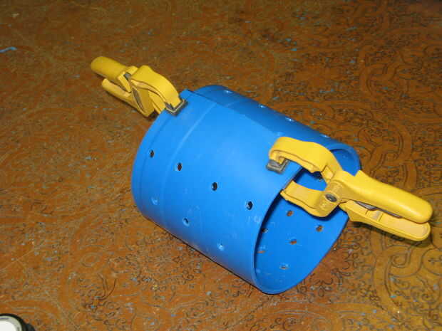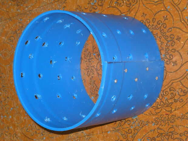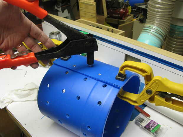 Trabajar la pieza de plástico perforada en un cilindro y la abrazadera en su lugar (Foto 1). Taladre orificios de 1/8" e inserte el largo aluminio remaches para sujetar las piezas juntas (fotos 2 y 3).