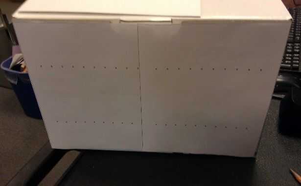 + Descubrí que el lado largo de la caja de tóner era básicamente 2 x el tamaño del lado corto, así que utilicé la misma caja de texto, y espaciadas dos filas de "X" s en la misma línea que tenía sólo 3 s "X" para los orificios para taquetes. (por lo que sería la misma altura de las varillas).