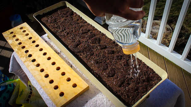 Fondo del agua las semillas que se plantaron apenas. Mantenga el suelo húmedo mientras que las semillas están germinando.