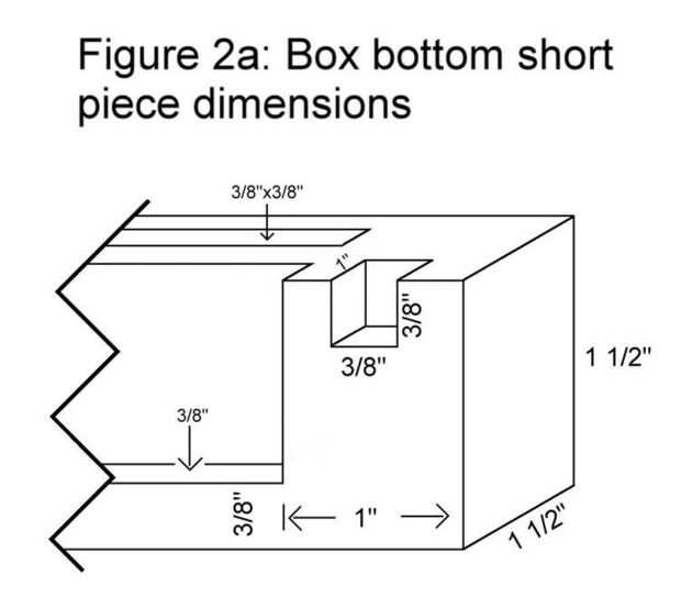 Los dos pedazos más cortos se dirigen exactamente de la misma manera, excepto que usted debe comenzar sus canales de 1 pulgadas de un extremo y poner fin a sus canales de 1 pulgada desde el otro extremo. En las áreas de 1 pulgada en cada extremo de estas piezas donde no derrota de un canal. necesita fresar una ranura de 3/8 de pulgada desde el extremo y 1/2 pulgada de largo. Cada extremo de estas piezas se verá como la figura 2 con las dimensiones indicadas en la Figura 2a.