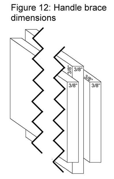 Corte la Base de la manija: una muesca de 3/8 de pulgada a lo largo de la longitud de la pieza en ambos lados de los dos bordes laterales de la derrota. Esto producirá una 3/8 de pulgada amplia "lengua" que cabe en los canales en los marcos superior e inferior. En los bordes cortos, la derrota de un canal profundo de 3/8 de pulgada hacia abajo del centro de ambos bordes. La pieza resultante se verá como figura 12. Centro de esta pieza en el canal del marco inferior en el lado donde quieres la manija y pegamento y sujete en su lugar, comprobando con su L cuadrada para una verdadera 90 grados. NO pegar a la parte superior del marco. Esperaremos para fijar la manija hasta que tenemos los paneles insertar y atornilla el marco superior.